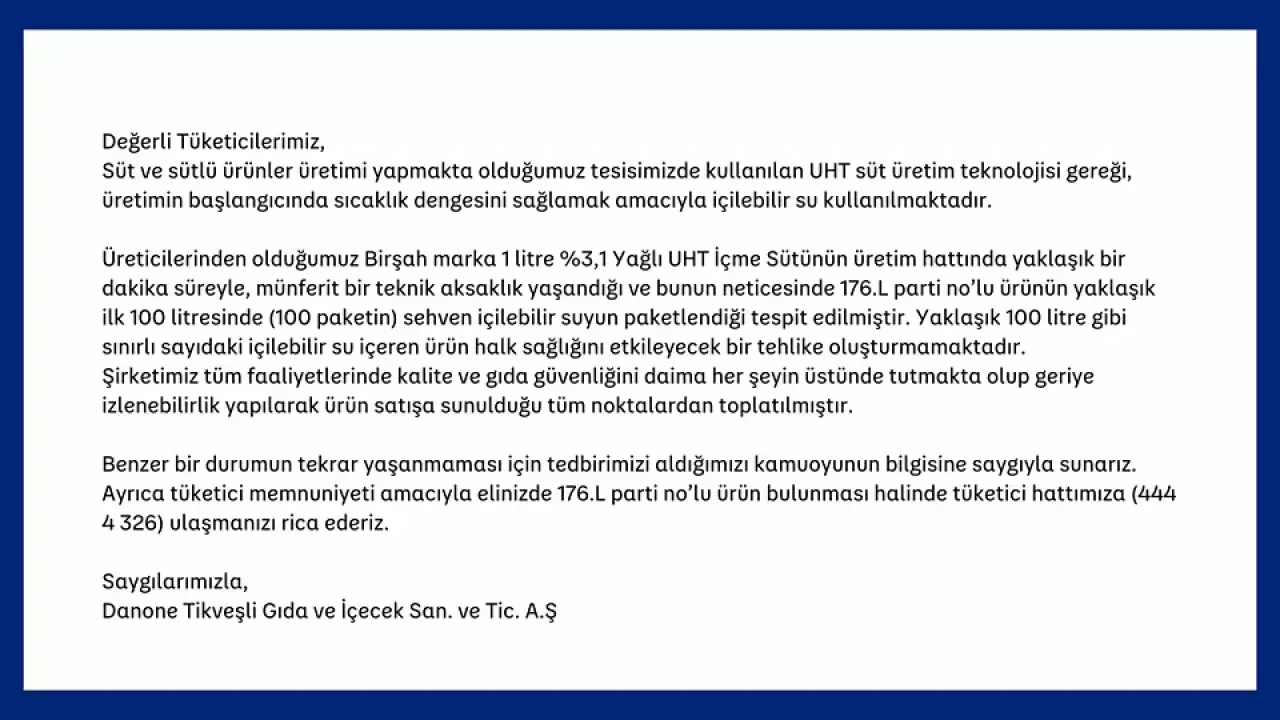 Danone firmasının yaptığı açıklamada, Birşah markasına ait sütlerin üretim aşamasında teknik bir sorun nedeniyle içme suyunun bazı paketlere karıştığını ve bu ürünlerin piyasaya sürülmeden toplandığını belirtti. Sağlık açısından herhangi bir risk oluşturmadığı ifade edilirken, firmanın ürünlerin kalitesine verdiği önem vurgulandı.