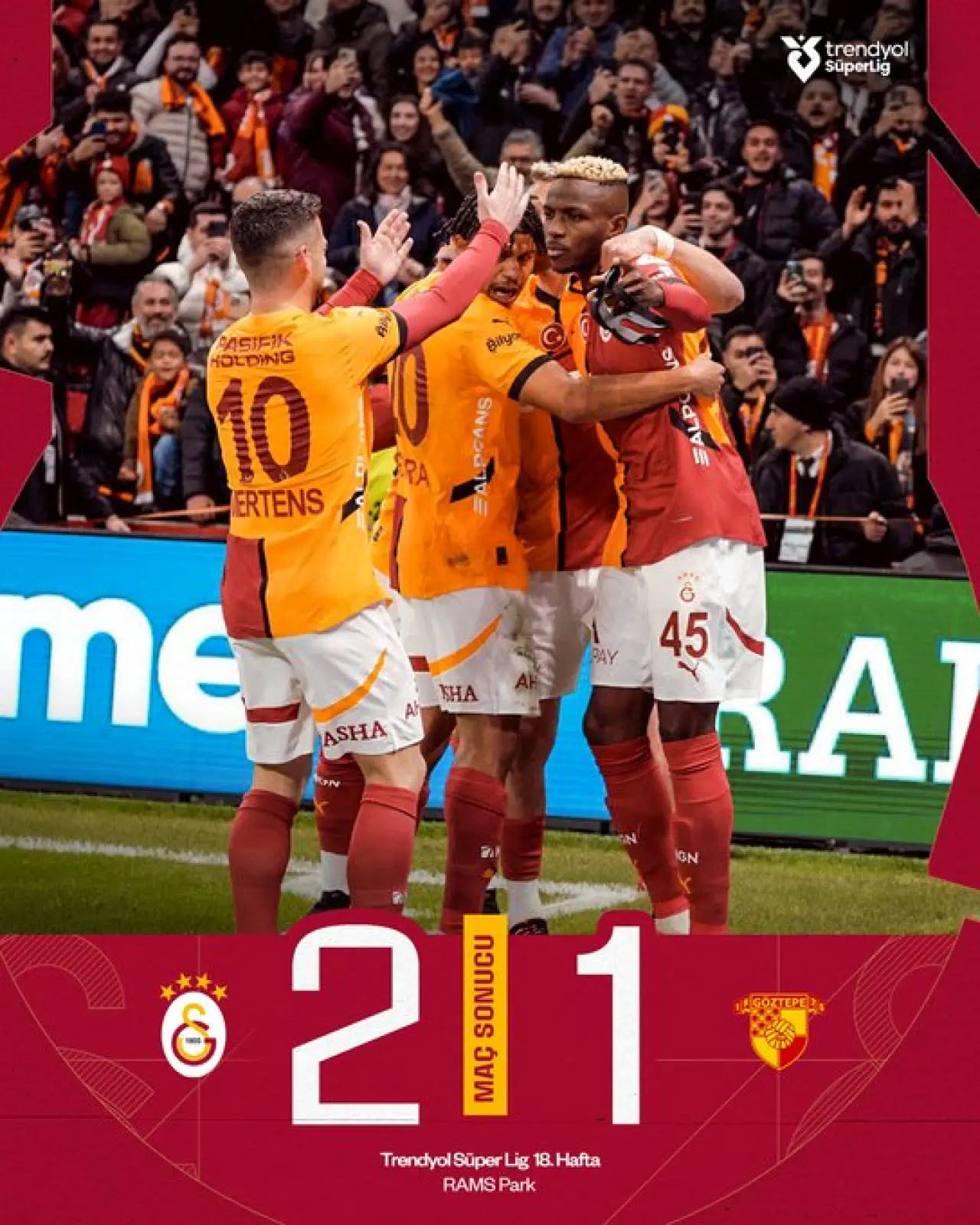 Galatasaray, Süper Lig'in 17. haftasında Göztepe'yi konuk etti. Karşılaşmayı hakem Alper Akarsu yönetirken, sarı-kırmızılı ekip olağanüstü performansıyla maçı kazanmayı başardı.